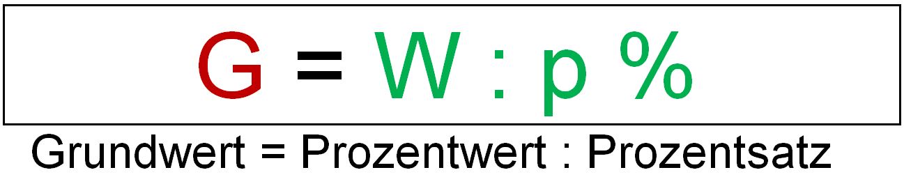 gesucht: Grundwert; Formel: G = W : p %